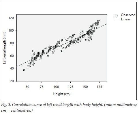 The RL has been correlated with the children's age (right, r=0.930; left, r=0.913), and weight (right, r=0.934; left, r=0.917). The length of both the right (r=0.966) and the left (r=0.958) kidneys showed the strongest correlation with body height.