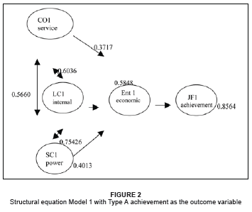 On the grounds of the significant relationships indicated by the Pearson product-moment correlation and multiple-regression analysis of a previous study (Van Wyk & Boshoff, 2000; Van Wyk, Boshoff & Bester, 1999), two structural-equation models were investigated, with the prediction of achievement and global Type A as outcome variables. Structural-equation models were not built to predict hard driving and competitiveness, and speed and impatience, as these variables are not predicted well by means of multiple regression (Van Wyk & Boshoff, 2000). The predictions of achievement and global Type A are illustrated in Figures 2 and 3. Confirmatory factor analysis was performed to evaluate the strength of the model fit, as indicated in Tables 1 and 2.