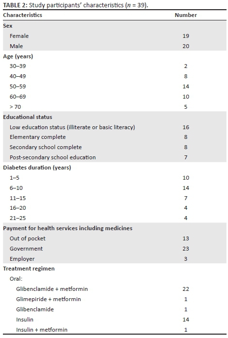 In total, 45 individuals were invited to participate in this study of whom 39 participated. The six who were not able to participate cited personal reasons or there were problems in gaining access to them via telephone. Of the study participants, 24 were from Addis Ababa attending treatment at Tikur Anbessa and Yekatit 12 (12 from each site), and the remaining were from Butajira town or its environs. Most of the study participants were on either a combination of glibenclamide (popularly referred to using the innovator brand name of Daonil) and metformin (22/39) or insulin (14/39). Close to two-thirds of participants were enrolled in a government care programme that allowed free medical treatment and medications for those who were determined to be of 'very low' economic status. Thirteen of the participants reported having to pay out of pocket for their treatment including medications. Table 2 summarises relevant demographic and treatment characteristics of the study participants. Notable differences were not evident in the perceptions and experiences of the participants from the different sites, and thus the findings are presented as a single set.