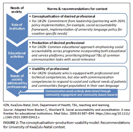 The conceptualisation-production-usability (CPU) model in social accountability refers to the development of a partnership between the educational institution and the health system that could be achieved through establishing a shared and common set of values between the stakeholders.28 The role of the institution lies in conceptualising the norms for the desired professional and in directing educational activities towards the production of such a professional. The necessary qualities of such a professional have been described in various models24,25,27 that emphasise the moral and social obligations of doctors to society. The competency-based approach asserts that the competencies acquired during training should be appropriate for the future working environment.14 With the role of communicator considered an essential competency, it is evident that the language requirement, an important priority for graduates, remains unresolved. To be a competent communicator and to improve doctors' usability in the health system, such a doctor should be sufficiently skilled to provide clinical care especially at primary level to isiZulu-speaking patients (Figure 2).