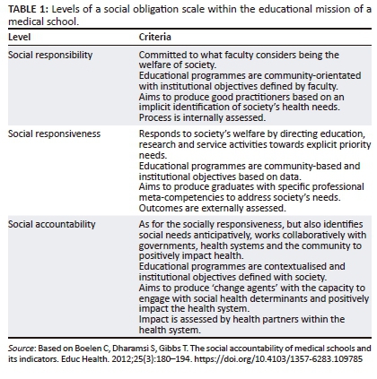 Additionally, the HPCSA has recommended the use of a social accountability framework for the accreditation of curricula of medical schools28 in an effort to improve social accountability.11,29,30 Social accountability refers to the obligation of medical schools to direct education, research and service to address the priority needs of the communities that they serve.29 The rationale asserts that medical schools shape the health care system and in response are shaped by it. It further asserts that medical schools, in meriting taxpayer's support, should fulfil their obligations to society by offering programmes that will positively impact on the health of communities served by them. The use of social accountability frameworks thus holds medical schools accountable to society and increasingly drives the creation of relevant health systems based on people's needs.31