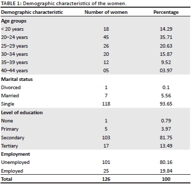 The overall mean age of the 126 participants was 26.1 years, with a standard deviation of 6.55 years. Most of the women (45 or 35.7%) were in the age group of 20-24 years (see Table 1). The majority of the women (93.7%, 118) were single. The majority of the women (103, 81.75%) had reached the secondary level of education. Most of the women (101, 80.16%) were unemployed.