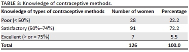 RESULTS: The mean age of the 126 participants was 26.1 years. Findings obtained after analysis of participants' data were grouped following the university categorisation. A score below 50% was referred to as a 'poor' outcome that from 50% to 74% was referred to as a 'satisfactory' outcome and that beyond 74% was considered as an 'excellent' outcome. Knowledge was poor for 28 (22.2%) women. It was satisfactory for 91 (72.2%) women and excellent for 7 (5.5%) women. Looking at the attitude: 124 (98.4%) approved the use of contraception, 1 (0.79%) disapproved and 1 (0.79%) abstained because of religious beliefs. Regarding the practice of contraception: 92 (73.0%) have already used contraceptive methods, while 34 (27.0%) have not