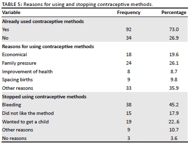 Except for other reasons (35.9%) that were not revealed by the participants, family pressure (24%) followed by economic reasons (19.6%), then spacing births and improvement of health (8.7%) were the reasons that led to the practice of contraception in Hammanskraal.