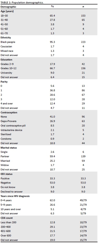 There were 247 gathered responses and 234 met the inclusion criteria and analysed. Thirteen women were excluded for being under the age of 18 years (n = 8) or not entering their age (n = 5). The demographics of the cohort are shown in Table 1. The mean age was 29 years (standard deviation [s.d.] = 8.3 years, range 18-70 years) and 34.6% (n = 81) women were aged 30 and above. Ninety-five per cent (n = 223) women were black and answered in isiZulu. Overall, 66.7% of women had completed education grade 10 and 9.0% (n = 21) had a university education. One-third of women (n = 79) were HIV-positive. Of the HIV-positive women, 93.7% (n = 74) entered their year of diagnosis. Early acquisition of HIV as a teenager had affected 6.8% (n = 5) of women and 5.4% (n = 4) had HIV for over 10 years. Data on their latest cluster of differentiation 4 (CD4) count were supplied by 81.0% (n = 64) of the HIV-positive women, with 10 women reporting a CD4 count of less than 200 (Table 1).