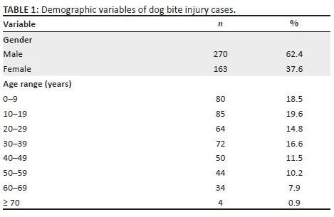 As seen in Table 1, most of the patients were male patients (62.4%) with the highest percentage of patients (19.6%) in the age group 10 to 19 years. The median age for cases with the most dog bite injuries was 26 years (range 11-44 years). The youngest case was less than a year old and the oldest 76 years.