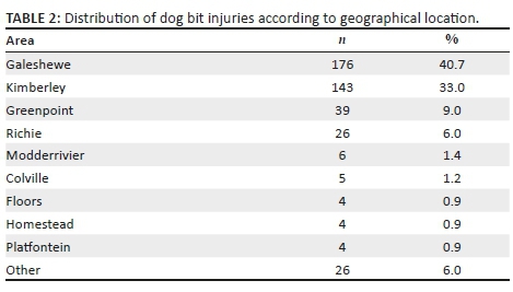 Table 2 shows the distribution of dog bite injuries by geographical location. Combined, more than 70% of dog bite patients came from Galeshewe (40.7%) and Kimberley (33.0%).