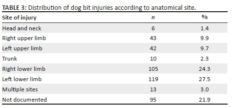 The dog bite injuries were categorised as follows: category I (1.2%, n = 5), category II (59.4%, n = 257) and category III (31.2%, n = 135). For 8.3% (n = 36) of the injuries, the category was not documented.