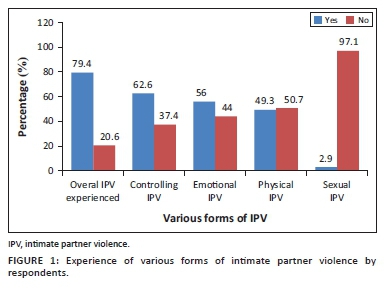 Out of the 209 women interviewed, 166 experienced any one type of IPV. This gives the overall IPV prevalence of 79.4% amongst the population studied. The prevalence of the various forms of IPV amongst the respondents was 62.6%, 56%, 49.3% and 2.9% for partner's controlling behaviour, emotional IPV, physical IPV and sexual IPV, respectively (Figure 1).