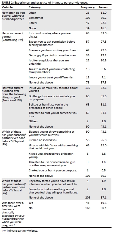 Table 2 shows the incidences of IPV experienced by the respondents. The most experienced controlling IPV as reported by the respondents was their partners insisting on knowing where they were always (69; 33.0%), while their partner ignoring or treating them differently was the least reported (15; 7.1%). Only 78 (37.3%) of them never experienced any form of controlling behaviour. Of the different types of emotional IPV, 110 (52.6%) of the respondents said that they were insulted or made to feel bad about themselves whilst 65 (31.1%) of the respondents were belittled or humiliated in the presence of other people or threatened of being hurt. Sixty-three (30.1%) of them have had all these forms of emotional IPV which have been discussed. Ninety (43.1%) respondents have been slapped or have had hurtful objects hurled at by their partners whilst one (0.5%) of the respondents said that she was choked on purpose. Forty-one (19.6%) were physically assaulted by partners whilst they were pregnant. Four (1.9%) of the respondents have been forced to have sexual intercourse when not willing and two (1.0%) were forced to get involved in degrading or humiliating sexual acts.