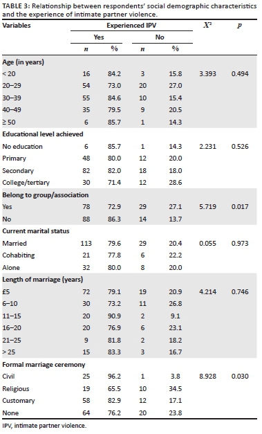 Belonging to a group/association showed a significant association with IPV experience (p = 0.017). Also, formalising a marriage had a statistically significant relationship with experience of IPV (p = 0.030) (Table 3).