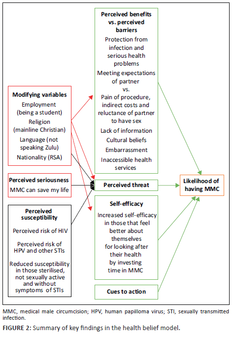 The health belief model helps to focus attention on key issues that health promotion should focus on in this community. The perceived susceptibility to and seriousness of HIV infection should be addressed and, in particular, misinformation regarding the protection offered by sterilisation as well as the absence of risk if there are no symptoms of an STI. The value of MMC to reduce future risk, even if one is not currently sexually active, should also be addressed.