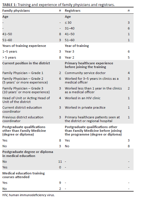 The participants' characteristics are shown in Table 1. The FPs ranged in age from 41 to 60 years and had more than 5 years of registrar-training experience. Many FPs had attended short training courses, but none had any formal medical education training. The registrars' ages ranged from 30 to 60 years. Six were in their third year of study and five in the second year. All the registrars had some PHC experience before joining the programme.