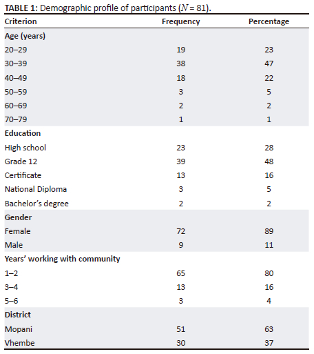This study included 81 participants ranging in age from 20 to 79 years. The majority were females who had completed their Grade 12 certificates. A bachelor's degree was the highest qualification. The demographic characteristics of CHWs are shown in Table 1.