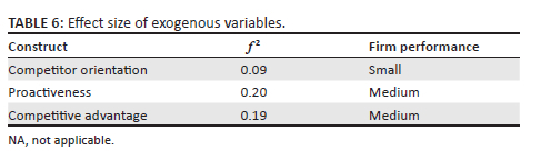 According to Cohen (1988), f2 values of 0.02, 0.15 and 0.35 represent small, medium and large impacts, respectively. When the effect size of the exogenous variables on the endogenous variable of this study was tested, the results showed that the effect size of competitor orientation on SMEs' performance was 0.09, suggesting that it has a small effect size on SMEs' performance. On the other hand, proactiveness had a f2 value of 0.20, indicating that proactiveness has a medium effect on SMEs' performance. Finally, and similarly to proactiveness, competitive advantage had a f2 value of 0.19, demonstrating that competitive advantage has a medium effect size on SMEs' performance in Nigeria.