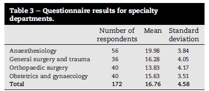 The mean and standard deviation (SD) for correctly answered questions was 16.76 (±4.58) from 32 questions for all respondents as shown in Table 3. Specialty department means were: Anaesthesiology 19.98 (±3.84), General Surgery and Trauma 16.28 (±4.05), Orthopaedic Surgery 13.83 (±4.17) and Obstetrics and Gynaecology 15.63 (±3.51). Clinician rank means were: interns' 14.82 (±4.49), medical officers' 15.65 (±4.03), registrars' 17.0 (±4.34) and consultants' 20.09 (±3.67) as shown in Table 4.