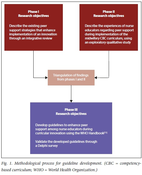 The practice guidelines were developed through a qualitative research design using multiple data collection methods, guided by the World Health Organization (WHO) Handbook for Guideline Development as a framework.[10,11]-The guideline development process entailed three separate phases, each addressing a specific objective(s) through interrelated studies (Fig. 1). The study conducted in phase I synthesised existing peer support strategies that enhanced the implementation of an innovation or new programme among professionals between 2000 and 2016 through an integrative review. The details and findings of the integrative review have been reported elsewhere.[11] Phase II entailed a qualitative study that described the experiences of midwife educators regarding peer support during the implementation of a new curriculum in Lesotho. Data were collected from 12 midwife educators through unstructured interviews, which were recorded, transcribed verbatim and analysed inductively. The details and findings of this study are reported elsewhere.[12]