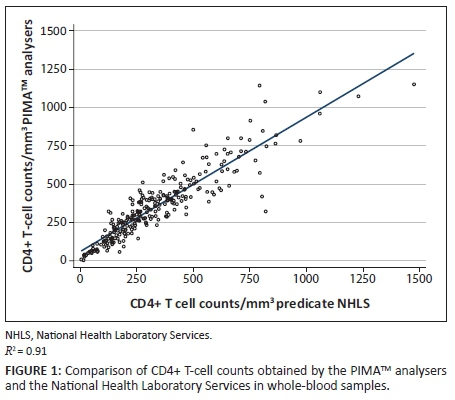 The adequate correlation between the PIMA™ POC analyser and FACS Calibur (0.97) corroborates similar findings in another study.21 Although a correlation of > 0.90 was observed between the three platforms, these differences are due to variability of instrument settings, antibodies and fluorochromes used, gating strategies and sample volume input.