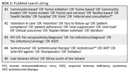 Studies were identified through bibliographic searches of PubMed and PDQ-Evidence publication databases by using the following terms and variations: 'community based'; 'home initiation'; 'community models'; 'home care services'; 'health facility'; 'clinic'; 'antiretroviral therapy'; 'antiretroviral'; 'clinical outcomes'; 'patient adherence'; 'patient compliance'; 'viral load'; 'viral suppression'; 'retention'; 'retention in care'; 'loss to follow-up'; 'attrition'; and 'HIV'. The search strategy was limited to studies conducted in SSA and published in English from January 2009 through July 2019. The PubMed search strategy is summarised in Box 1.