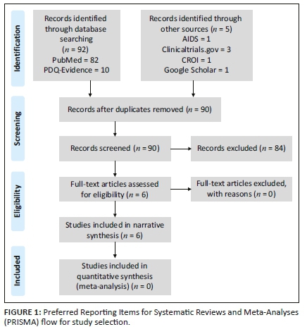 We also conducted a grey literature search that was limited to abstracts from the following major HIV-related conferences: Conference on Retroviruses and Opportunistic Infections (CROI), the International AIDS Conference, International Conference on AIDS and STDs in Africa (ICASA), Southern African HIV Clinicians' Society Conference and the South African AIDS Conference. In addition, we searched clinical trial databases for planned or ongoing research via the U.S. National Library of Medicine Register of Clinical Trials (clinicaltrials.gov) and the WHO (World Health Organisation) International Clinical Trials Registry Platform (ICTRP). Three technical experts on HIV care and treatment were also contacted by e-mail for comment on the appropriateness of the identified literature and additional articles.