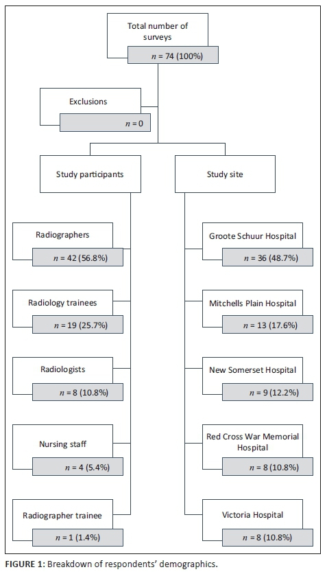 A survey design was used in this study. Data were collected from radiology staff at five sites across Cape Town over a 3-month period. The sites included two tertiary centres - Groote Schuur Hospital and Red Cross War Memorial Children's Hospital - and three secondary centres: Mitchells Plain Hospital, New Somerset Hospital and Victoria Hospital. The metropole's tertiary centres (including Tygerberg Hospital) combined provide 2631 beds to the public healthcare service in Cape Town and manage more than 700 000 outpatients and 120 000 EC contacts annually. The secondary centres provide 1393 beds to the public health care service in Cape Town and manage more than 240 000 outpatients and 165 000 EC contacts annually.14 For the 4.5 million people in the Western Cape who access public health care, a total of 60 531 Computed tomography (CT) scans were performed annually in 2013. Just over 29 000 (48%) of these CT scans were performed in the Western Metropole's hospitals in the region covered in our study.15