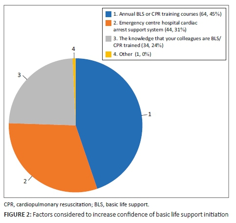 Of course, this study only reports confidence levels and not actual performance which can both be better or worse than the reported confidence would suggest. Numerous international studies have shown lack of confidence in initiating BLS when confronted with cardiac arrest, not only amongst general nurses, students or non-surgical disciplines, but also within emergency care staff.16,17,18,19,20 Maharaj concluded that emergency care staff working in both public and private settings in South Africa were not sufficiently confident to initiate BLS. As in our study, they showed that the presence of an appropriately trained clinician leading resuscitation boosted confidence in performing BLS.7
