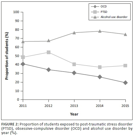 The proportion of students exposed to various psychiatric conditions, by year, is shown in Table 2. The proportion of students exposed to OCD, PTSD and alcohol use disorder was found to vary significantly across years, as shown in Figure 2.