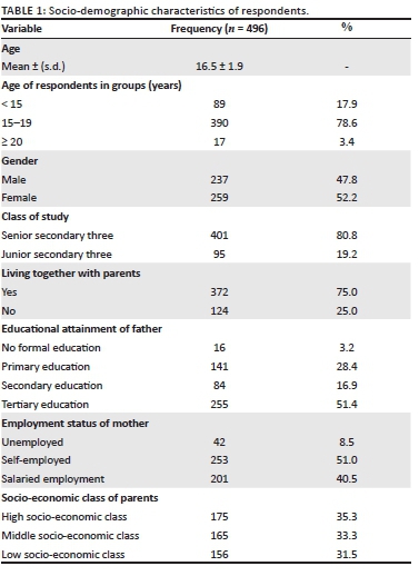 Table 1 shows the socio-demographic characteristics of the respondents. The mean age of the respondents was 16.5 ± 1.9 years, and the majority of the respondents, 78.6% were in the age group 15-19 years. A higher proportion of the respondents, 52.2%, were females. The majority of the respondents, 80.8%, were in senior secondary, third grade.