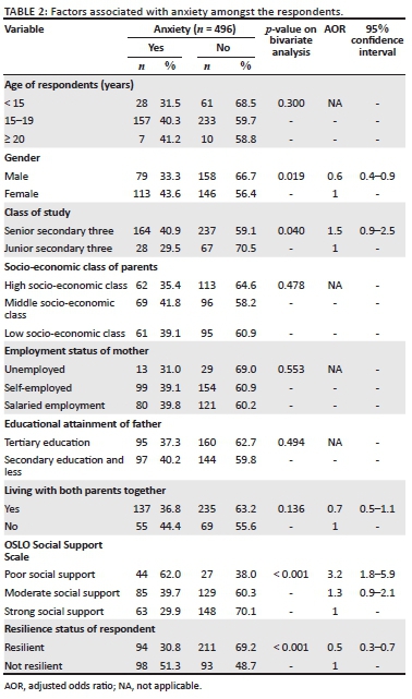 Table 2 shows the factors associated with anxiety amongst the respondents. The male respondents were about twice less likely to be anxious when compared with female respondents (adjusted odds ratio [AOR] = 0.6, 95% CI: 0.4-0.9). The respondents who had poor social support were 3.2 times more likely to be anxious when compared with those who had strong social support (AOR = 3.2, 95% CI: 1.8-5.9). The respondents who were resilient were twice less likely to be anxious when compared with those who were not resilient (AOR = 0.5, 95% CI: 0.3-0.7).
