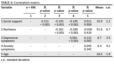 Table 4 shows the correlation matrix. There is a weak positive correlation between social support and resilience, increases in resilience correlated with increases in social support and this was found to be statistically significant (n = 496, r = 0.321, p < 0.001). There was a very weak negative correlation between resilience and anxiety symptoms, increases in resilience correlated with decreases in anxiety symptoms and this was found to be statistically significant, (n = 496, r = -0.269, p < 0.001). There was a strong positive correlation between anxiety and depressive symptoms, increases in anxiety symptoms correlated with increases in depressive symptoms and this was found to be statistically significant (n = 496, r = 0.581, p < 0.001).