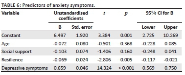 Table 5 shows the regression model summary. With the adjusted R2 of 0.351, the model predicts that 35.1% of variability in anxiety symptoms is explained by age, social support, resilience and depressive symptoms.