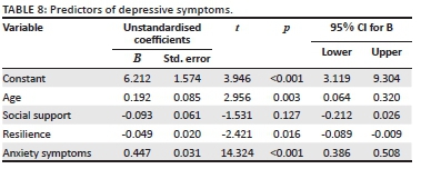 Table 7 shows the regression model summary. With the adjusted R-square of 0.359, the model predicts that 35.9% of variability in depressive symptoms is explained by age, social support, resilience and anxiety symptoms.