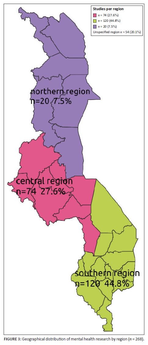 This systematic mapping found that research on mental health issues was concentrated in the three cities of Lilongwe (17.9%, n = 48), Blantyre (16.4%, n = 44) and Zomba (9.0%, n = 24), with minimal studies conducted in other districts across the country (Figure 2). Some studies were conducted in multiple districts (42), increasing n to 268 when each district was counted alone against a particular study (Figure 2). However, no published studies on mental health issues from Likoma, Nkhotakota and Mwanza districts were found. Furthermore, the systematic mapping showed that many studies (44.8%, n = 120) were conducted in the southern region of the country (Figure 3).