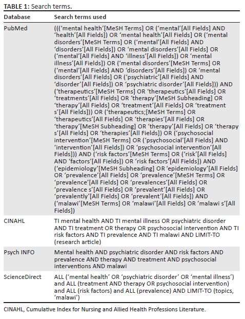 The authors searched for published articles about the biopsychosocial factors (how biological, psychological and social functioning interact), trends and social determinants in population mental health treatment of mental disorders and psychosocial interventions in Malawi. An initial search firstly involved a search across all databases that were included using all identified keywords and index terms. Secondly, additional studies were sought from the reference list of all identified articles. The systematic mapping included studies that were published in English. The first author, together with an information scientist (F.C.), constructed the following search terms that were initially used to conduct a search: (Mental health OR Mental illness Or Mental Disorders OR Mental Health problems) AND (prevalence OR treatment OR psychosocial intervention) AND (Malawi OR 'Name of specific district'). The final search for each database was done using search terms that are presented in Table 1.
