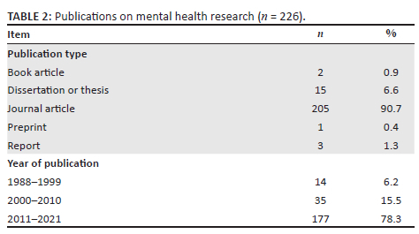 Publications on mental health research: The decadal categorisation of publications was used for easy categorisation of mental health research in this study. This systematic mapping showed that there were few research studies on mental health issues in Malawi that were published before the year 2000 (Table 2). However, the mapping also revealed that there has been a plethora of scientific publications on mental health issues (78.3%, n = 177) in the country since 2011. This systematic mapping further found that many research studies that were conducted in Malawi were published in peer-reviewed journals (90.7%, n = 205) (Table 2). The mapping also showed that some studies were available online in the form of dissertations or theses (6.6%, n = 15).