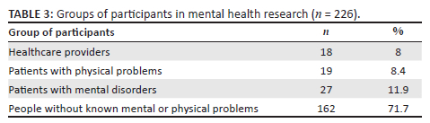 Groups of participants in mental health research: This systematic mapping revealed that people without known mental or physical problems (71.7%, n = 162) were the group that participated in most mental health research in Malawi (Table 3).