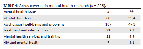 Areas covered in mental health research: This systematic mapping showed that psychosocial well-being and problems (47.3%, n = 107) was the area that was most covered in mental health research in Malawi (Table 4). There was less than 10.0% of mental health research that focused on treatment and interventions in the country.