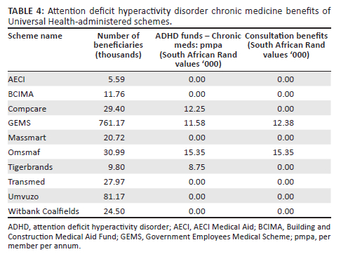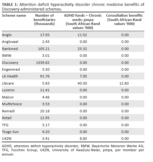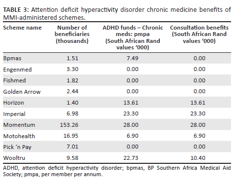 The general mental healthcare benefits indirectly assist people with ADHD who have other mental health comorbidities.13 The 21-day in-hospital admission (n = 102 medical scheme options) would not assist people with ADHD directly, but indirectly it could help them deal with comorbid conditions such as anxiety, depression or substance abuse, which is rife among ADHD patients.10