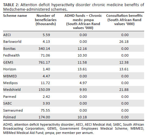 There is currently a lack of scientific data regarding administrators of medical schemes in South Africa. Data regarding comparisons between all the medical schemes are also lacking. This is the first comparative study of its kind in South Africa. The study on MMI by Schoeman and De Klerk suggested that funding was insufficient in view of the excessive OoP expenses that patients were required to pay to obtain ADHD management and care.14 Further literature revealed, at the respective times of the studies, that 2.5% - 4.3% of adults struggled with prominent ADHD symptoms that impacted their daily functioning significantly,1,2 and that none of the medical schemes had adult-specific ADHD benefits. The closest to ADHD-specific benefits were 13 scheme options across all the schemes that dedicated either chronic medicine or consultations under their childhood wellness programmes for ADHD management. These programmes were however limited only to beneficiaries below the age of 21 years.