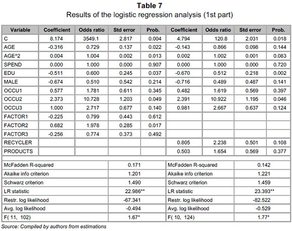 Two approaches were again followed, with the last variable being green views: Firstly, the factor scores were included in the analysis (FACTOR1, FACTOR2, FACTOR3), and secondly, based on the individual factor scores, respondents were classified as belonging to one of these groups (RE-CYCLERS, GREEN PRODUCTS, GREEN MONEY) indicated in Table 6 above. "Green money" was chosen as the comparator group, since it received the lowest overall mean score of all three components extracted. With the classification system used, a respondent who leans more towards "green money" than towards any of the other categories will only be classified as "green money" (i.e. a dichotomous variable that takes the value of 1 in GREEN MONEY and 0 in both the other categories). However, it is true that a person who would like to buy carbon credits and who would like to support other green initiatives financially (i.e. GREEN MONEY), would also be keen to recycle (although slightly less). With the classification system, this is not taken into account. With the factor scores system, the scores take all the respondent's information into consideration and the respondent would therefore have a score for both "GREEN MONEY" and "RECYCLING", although the latter would be lower. Because the factors and classifications depend on one another, they are used separately in the analysis to avoid encountering problems associated with multicollinearity.