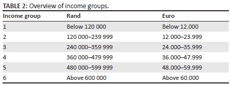 Finally, Table 1 shows the characteristics of the sample according to annual income. However, as the sample incudes respondents from Germany and South Africa, and these two countries have different currencies and the Euro is a stronger currency than the rand; respondents had to be grouped into similar annual income groups for ease of comparison. Table 2 provides the breakdown of the income groups. As is evident from Table 1, the majority of the respondents in this sample fall into income group 6 (above R600 000 or above €60 000 annually), followed closely by income group 2 (R120 000-R239 000 or €12 000-€23 999 annually).