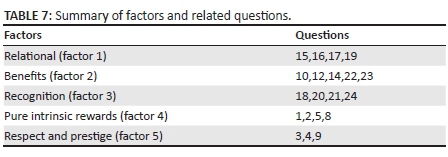 Once established that there were five factors, the researchers established which questions loaded onto which factors. A factor loading of 0.30 is considered as significant for a sample size higher and larger than 350 (Hair, Black, Babin & Anderson 2010). Table 6 shows which items loaded onto which factor, by highlighting the questions above the 0.30 level for that factor. Based on Table 6, the questions have been grouped into factors as shown in Table 7.