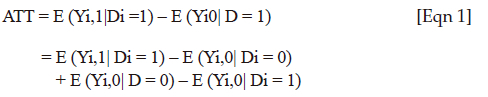 Where, yi,1 is the outcome of interest for households taking part in cooperatives (members) and E indicates the expectation operator. Di is a binary indicator that equals 1 if the members join in cooperatives and 0 otherwise. Yi0 is the result of the same household not participating in cooperatives (non-members). We are unable to simultaneously observe E (yi, 1|Di = 1) and E (yi, 0|Di = 1) for the same home when estimating ATT. If membership in the cooperatives is not chosen randomly and is conducted by the members'' own initiative, a straightforward comparison between the treatment group and control group involves selection bias, whose magnitude is shown in E (yi, 0|Di = 0) - E (yi, 0|Di = 1).