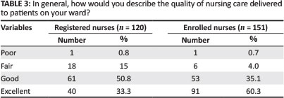 When asked about their general opinion on the quality of care delivered to patients on their ward, 61 (50.8%) of the RNs rated service as good and 91 (60.3%) of the ENs rated service as excellent (refer to Table 3). Chi-square analysis revealed a significant difference between RNs' and ENs' general opinion of the quality of care delivered: X2(3, N = 271) = 23.1, p = < 0.001.