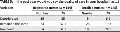 Deterioration of the quality of care was less commonly reported by the ENs, with 108 (74.5%) of the ENs agreeing that the quality of care in their hospitals had improved in the past year. For the RNs, an equal percentage of nurses (37.5%; n = 54) were of the opinion that the quality of care had either remained the same or had improved in the past year (refer to Table 5). The chi-square analysis revealed a significant difference between RNs' and ENs' perceptions about the quality of care in their hospitals: X 2(2, N = 289) = 42.4, p = < 0.001.