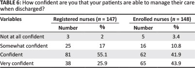 Close to 44% (n = 65) of the ENs were very confident that their patients were prepared adequately to manage their care at home upon discharge, whilst 81 (55.1%) of the RNs were confident (refer to Table 6). Yet again, the chi-square test revealed a significant difference between RNs' and ENs' confidence in patients managing their care when they are discharged from hospital: X 2(3, N = 295) = 12.0, p = < 0.001.