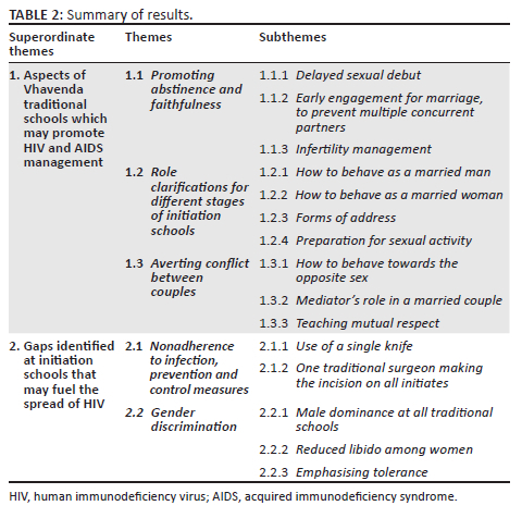 Two superordinate themes emerged from the data analysis, namely aspects of Vhavenda traditional schools which may promote HIV and AIDS management and gaps identified at initiation schools that may fuel the spread of HIV. Under each superordinate themes, several subthemes emerged (see Table 2).