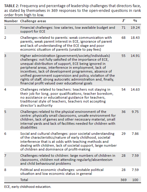 Of the total 166 directors in the sample, 145 (87%) answered the open-ended questions. Eight areas of challenge in director leadership were identified and are presented in Table 2. The three areas that the directors found most challenging are (1) financial challenges, (2) challenges related to collaboration with parents and (3) challenges related to higher administration. The following areas of challenge were also identified: (4) challenges related to teachers, (5) challenges related to the physical environment, (6) social and cultural challenges, (7) challenges related to children and (8) political and economic challenges.