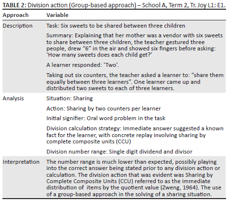 Across the 74 episodes of the three teachers, 9/74 episodes were identified as 'sharing through one-by-one distribution' (12%). A total of 34/74 episodes were associated with grouping actions or 'group-based approaches linked to sharing situations' (46%). A total of 23/34 episodes contained 'grouping through one-by-one distributions' and 'making groups based on the divisor'. A total of 11/34 episodes were linked to 'group-based approaches linked to sharing situations', which were 'CCU', 'GBD' and 'Sharing through one-by-1 grouping'. From Table 3, most episodes pointed away from only 'sharing through one-by-one distribution' to grouping actions and sharing situations linked to grouping actions. In other words, the division actions do not align with the notions in most of the South African and certain international literature that, in most cases, a preferred division model like sharing always has a sharing action (Booker et al. 1992; Carpenter et al. 1999; Fischbein et al. 1985; Roberts 2012; Squire & Bryant 2002a).