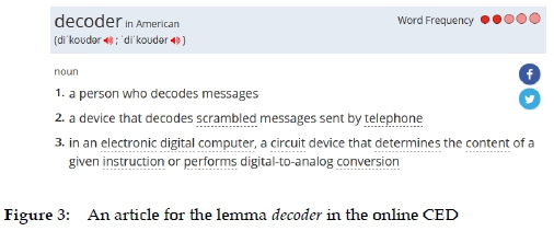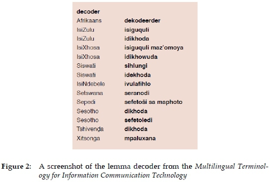 The screenshot illustrates the treatment of the term decoder in the Multilingual Terminology for Information Communication Technology, which is saved as a Multilingual ICT Dictionary. From this resource, the data that the user may access constitutes the translation equivalents in the other ten South African official languages. For some of the languages, two equivalents, a coinage and a transliterated borrowing, are provided. On the one hand, while the coinages may capture some properties of a decoder, they may not be easily understood by a mother-tongue speaker in terms of their specialized ICT designation, which lies somewhere between the three senses captured by the online Collins English Dictionary (CED) as follows: